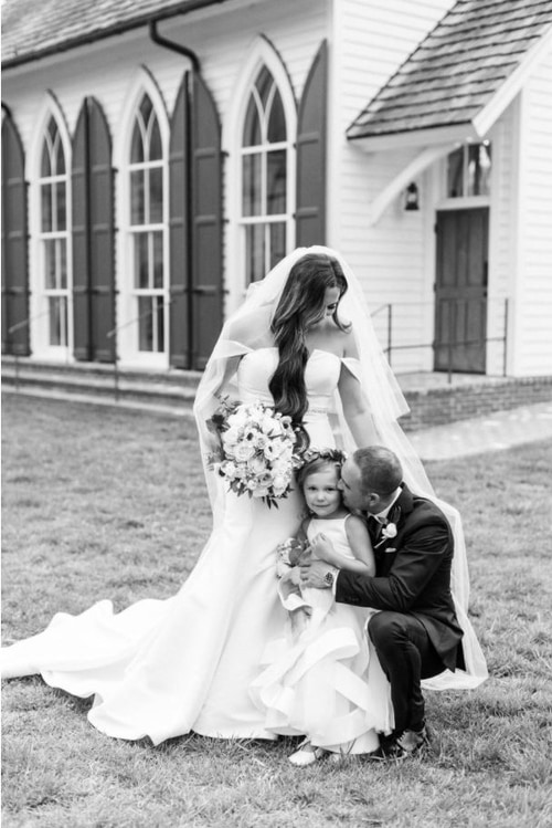 On the day of the wedding the ladies readied at the Lodge Spa Suite and the guys enjoyed a morning skeet shoot. Guests were shuttle to the chapel and welcomed by soft acoustic guitar melodies. The ceremony was made even more personal when Caty and Lucas not only exchanged rings themselves but Lucas presented Caty's daughter with a ring. The bridal party helped kick off joyful celebration in the Worman Room followed by a plated dinner. A custom cake by Shelby Lynn's featured several decedent flavors. Guests enjoyed selecting their favor candle scent from several options displayed and paired with custom matches. Lively dancing was enjoyed by all as a light rain misted outside concluding perfectly for a special sparkler send off!